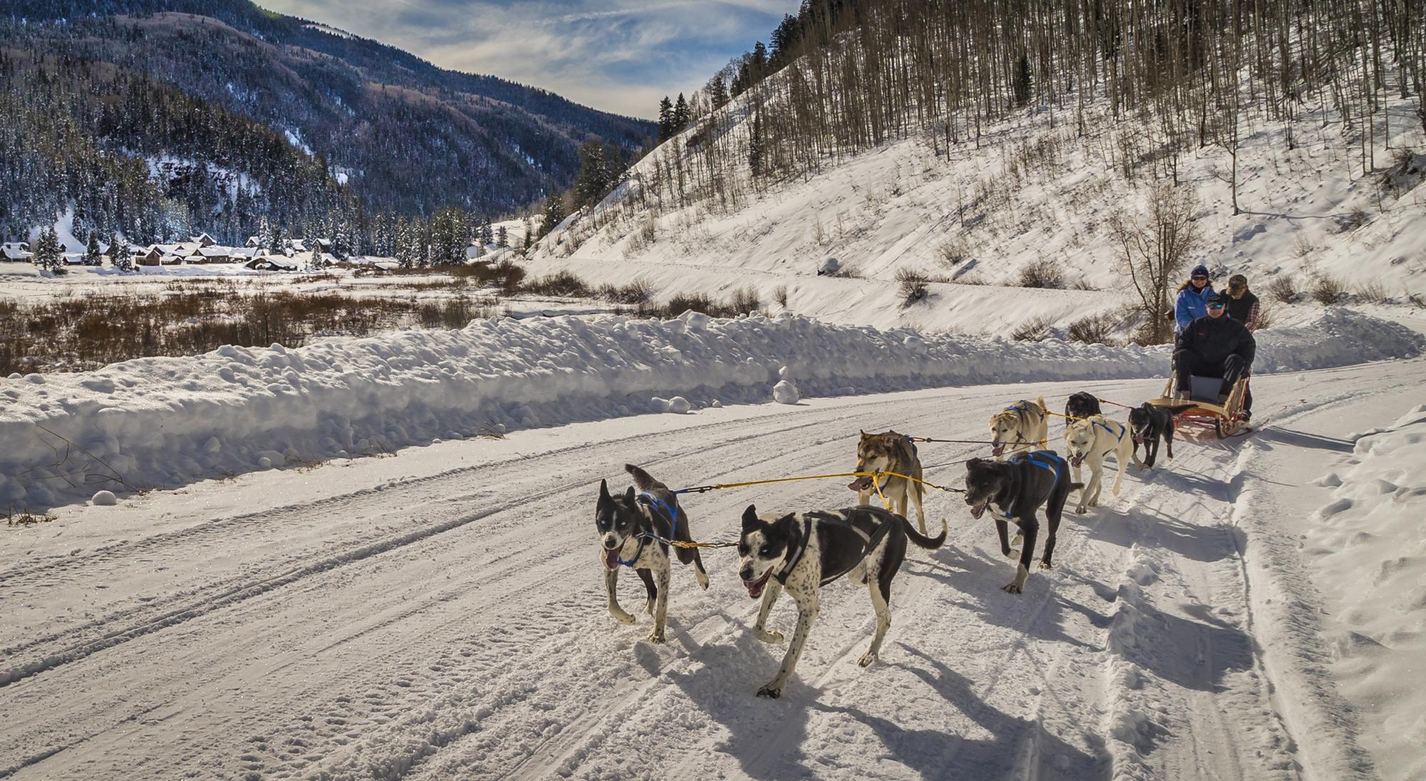 Dog sledding takes place in open winter terrain outside the valley.