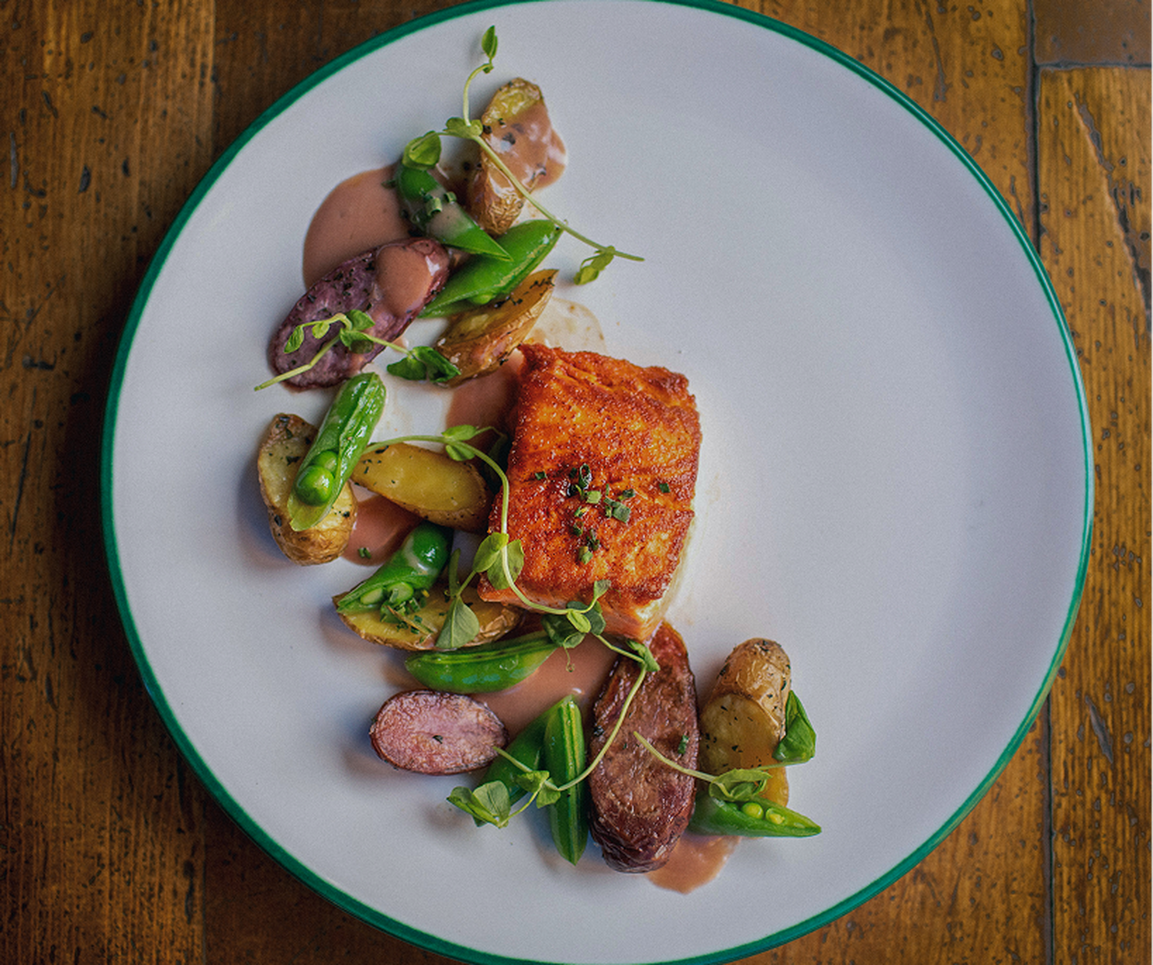 Our kitchens let ingredients lead. Spring brings wild greens and fresh fish from cold rivers. By late summer, tomatoes warm from the garden and fruit reaches its peak.