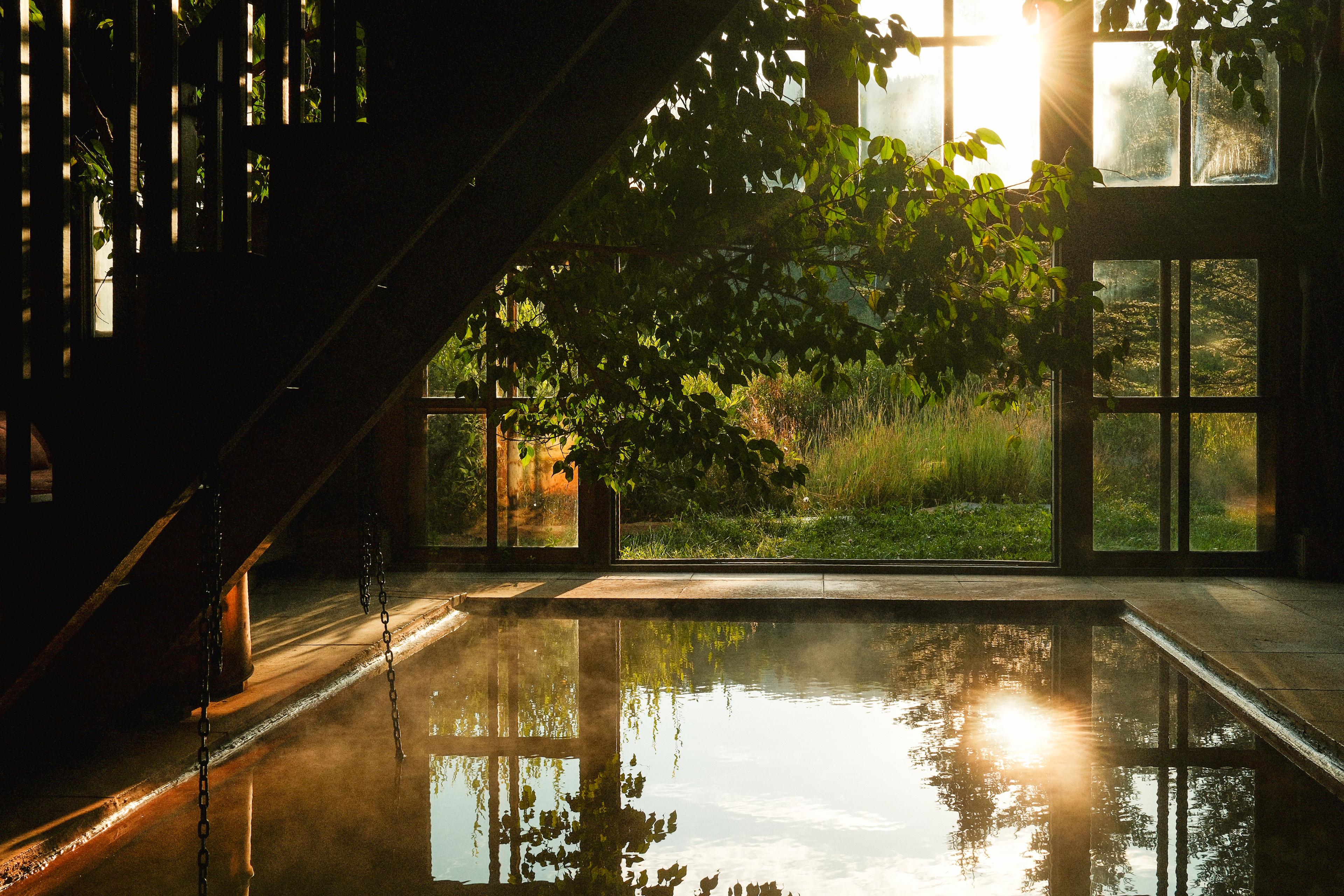 Mineral-rich water rises directly from the earth and is left largely as it is. Pools are set within restored wooden structures and open-air spaces, allowing time to move between warmth, cool air, and stillness.